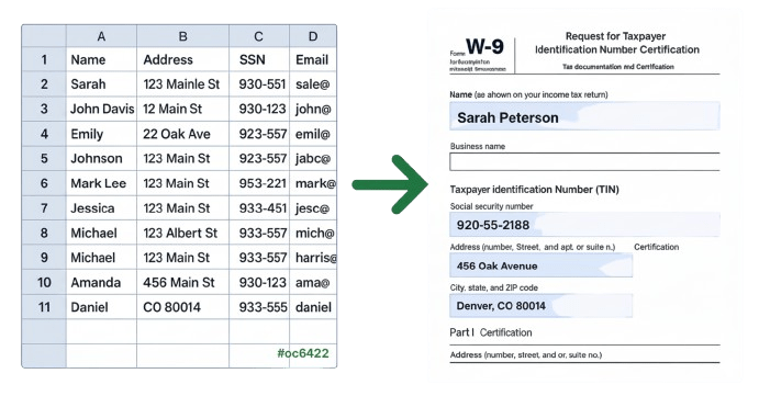 Our AI instantly connects your data to the right form fields. You'll get accurately filled forms in bulk in seconds.